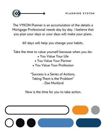 The VYKON (Performance) Planner is an accumulation of the details a Mortgage Professional needs day by day. I believe that you plan your days or your days will make your plans.